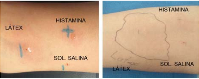 El uso de pruebas de parche está indicado en individuos con dermatitis de contacto a látex o reacciones de aparición retardada. El uso de biomarcadores (triptasa) puede ser de utilidad en reacciones anafilácticas.24