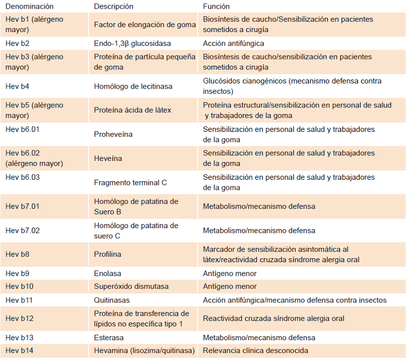 Recientemente, la Asociación Mundial de Alergia (WAO) ha clasificado los alérgenos de látex Hev b1, 3, 5 y 6 como genuinos alérgenos del látex y su positividad deberá ser una advertencia para usar medidas apropiadas de seguridad.26