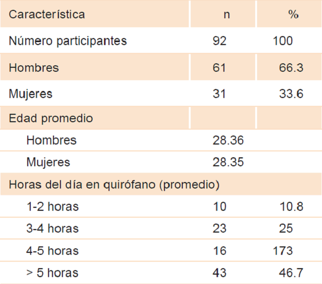 De estos 92 residentes del área quirúrgica 66.3 % fue del sexo masculino (n = 61) y 33.6 % (n = 31) del femenino. El promedio de edad de ambos grupos fue de 28.36 años, con un rango de 23 a 36 años. Participaron 11 especialidades del área quirúrgica: cirugía oncológica, cirugía general, ginecología y obstetricia, ortopedia, urología, coloproctología, cirugía cardiotorácica, angiología, prótesis maxilofacial y cirugía plástica reconstructiva (Cuadro 3).