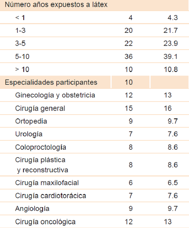 Resultados: Se incluyeron 92 sujetos a los cuales se les realizó pruebas cutáneas, participando 11 especialidades quirúrgicas. La sensibilización al látex en esta población fue de 11.9 % y la presencia de alergia al látex de 10.8 %.