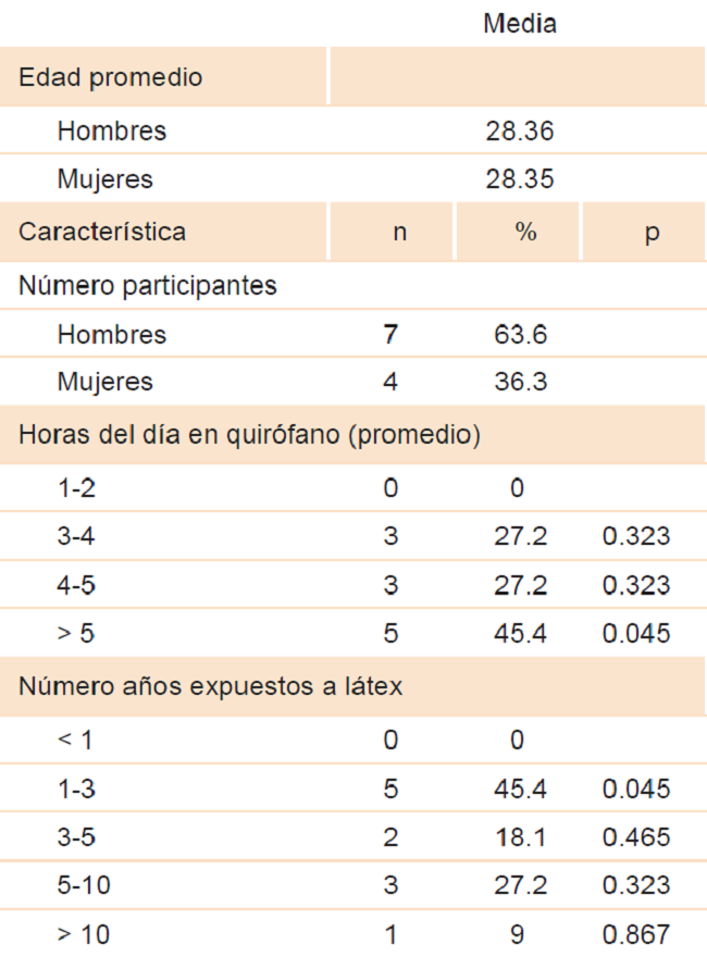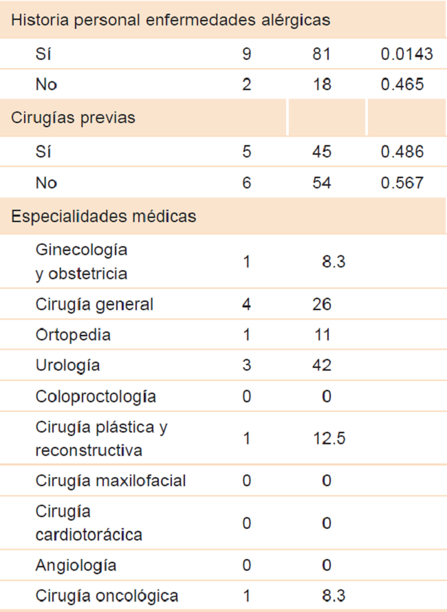 De las pruebas realizadas, 11 mostraron sensibilización; el tiempo diario de estancia en el quirófano (> 5 horas [45.4 %]) fue estadísticamente significativo (p = 0.045) y el número de años que se ha utilizado látex, que fue estadísticamente significativo en el grupo de uno a tres años de exposición (45 % [p = 0.045]). Otro antecedente de importancia en los sujetos sensibilizados fue la presencia concomitante de atopia en nueve (rinitis alérgica, dermatitis atópica, urticaria, asma, conjuntivitis alérgica, alergia alimentaria y angioedema), que fue estadísticamente significativa (p = 0.0143). La especialidad médica con mayor número de residentes sensibilizados al látex fue cirugía general (cuatro, 26 %) y la especialidad con mayor porcentaje de sensibilización fue urología (tres, 42 %) (Cuadro 4).