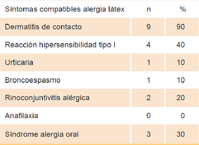 Las manifestaciones clínicas por hipersensibilidad del tipo I frente a las proteínas del látex son variadas y abarcan desde urticaria de contacto a la anafilaxia, pasando por la alergia respiratoria (rinitis y asma), lo que fue concordante con nuestro estudio, donde la primera manifestación clínica fue la dermatitis de contacto, seguida de rinitis alérgica, asma y síndrome de alergia oral; en nuestro estudio no tuvimos ningún caso de anafilaxia como manifestación clínica de alergia al látex.17