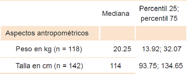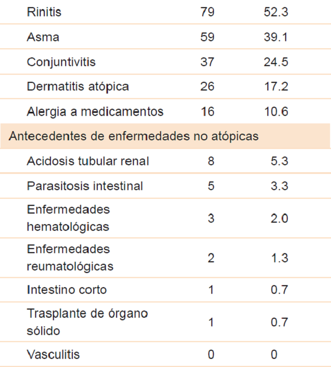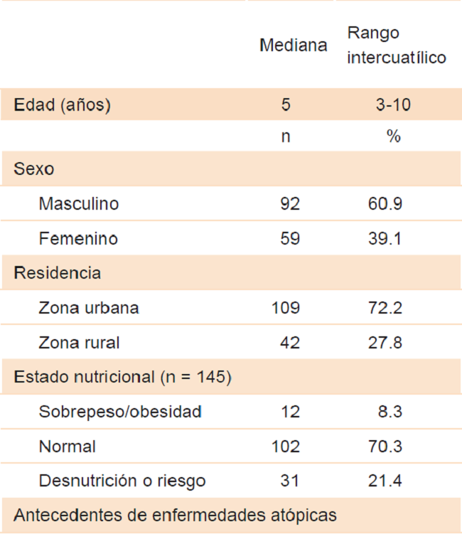 De 151 pacientes incluidos, 92 (60.9 %) fue del sexo femenino; la mediana de edad fue de cinco años y 72.2 % vivía en zona urbana. Respecto al estado nutricional, se obtuvo información de 145 pacientes, de los cuales 70.3 % estaba en rango de normalidad para su edad según la Organización Mundial de la Salud y 21.4 % en rango de desnutrición o riesgo de padecerla. El 66.9 % de los pacientes padecía alguna enfermedad atópica; la rinitis alérgica fue la más frecuente (52.3 %). Todas las características sociodemográficas, antropométricas y antecedentes personales se resumen en el Cuadro 1.