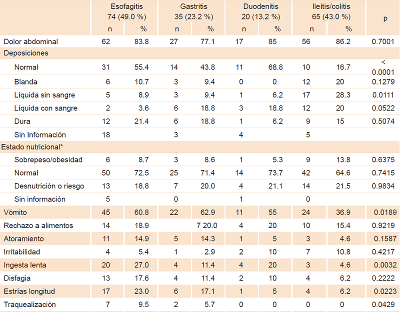 De cada paciente se recolectaron los siguientes datos: edad, sexo, peso y zona de residencia, dolor abdominal, gasto fecal, aspecto de las deposiciones, estado nutricional según la Organización Mundial de la Salud, vómito, rechazo alimentario, atoramiento, irritabilidad o disfagia. Adicionalmente se documentaron antecedentes de enfermedades atópicas, reumatológicas o hematológicas, vasculitis, síndrome de intestino corto, parasitosis intestinal o trasplante de órgano sólido.