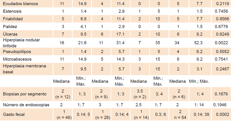 Entre los pacientes con gastroenteritis eosinofílica (GE) o duodenitis eosinofílica (DE), los síntomas más frecuentes fueron dolor abdominal, vómito, rechazo alimentario e ingesta lenta de alimentos; 18.8 % de los pacientes en ambos grupos reportó deposiciones líquidas con sangre. De los 35 pacientes con GE, seis (17.1 %) presentaron estrías longitudinales en la endoscopia, mientras que solo se encontró en un paciente con DE. Los exudados blancos y las úlceras se observaron en 11.4 % y en 17.1 % de los pacientes con GE, respectivamente. En estómago y duodeno, la media del conteo de eosinófilos por CAP fue de 24.37 ± 13.35 y 47 ± 19.46, respectivamente. La mediana del número de biopsias por segmento comprometido fue mayor en duodeno (3.5), sin alcanzar diferencia significativa respecto a los demás segmentos del tracto gastrointestinal.