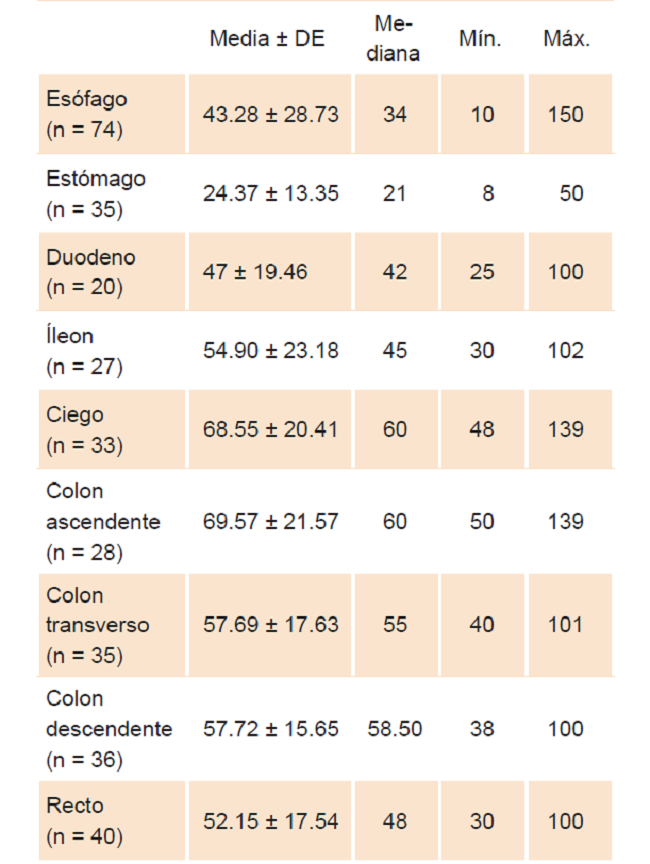 De los 151 niños con DGIE, 74 (49 %) tenían afectación de esófago, 35 (23.2 %) de estómago, 20 (13.2 %) de duodeno y 65 (43 %) de colon; 32 pacientes (21.2 %) tuvieron afectación de dos o más segmentos del tracto gastrointestinal.