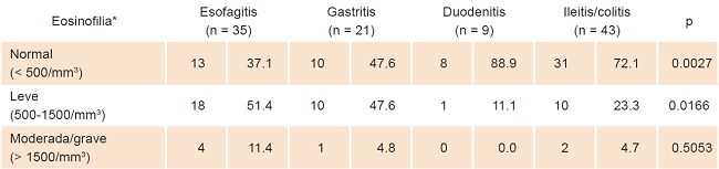La eosinofilia en sangre periférica se presentó en 39 % de los pacientes (n = 80) y fue significativamente más frecuente en los pacientes con compromiso del esófago y estómago, comparados con los pacientes con compromiso de duodeno y colon (62.8 y 52,4 % versus 11.1 y 28 %; p = 0.0027). La mayoría de los pacientes con eosinofilia estaban clasificados en el rango de eosinofilia leve (Cuadro 4).