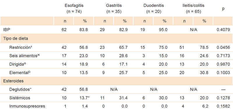Para el tratamiento de la EEo, 62 (84 %) pacientes recibieron IBP durante al menos ocho semanas, 42 (57 %) realizaron dieta de restricción de al menos un alimento (principalmente leche), en 42 (57 %) se prescribieron esteroides deglutidos (fluticasona o budesonida) y a 17 (23 %) se les indicó dieta de exclusión de los seis alimentos más alergénicos (leche, huevo, trigo, soya, frutos secos y mariscos/pescados). De los 35 pacientes que presentaron GE, 29 (83 %) recibieron IBP, 23 (66 %) realizaron dieta de restricción de al menos un alimento y en 11 (31.4 %) se prescribieron esteroides sistémicos. De los pacientes con DE, 19 (95 %) recibieron IBP, 15 (75 %) realizaron dieta de restricción y cinco (25 %) necesitaron dieta elemental exclusiva. Para el tratamiento de la ileítis o CE, 51 (78 %) pacientes realizaron dieta de restricción, en 13 (20 %) se prescribieron esteroides sistémicos y en cuatro (6 %), inmunosupresores sistémicos.