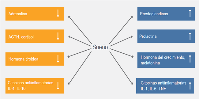 Las citocinas proinflamatorias IL-1, IL-6, TNF aumentan el sueño NO MOR espontáneo y las antiinflamatorias como IL-4, IL-10 e IL-13 lo disminuyen, tanto en humanos como en animales.38