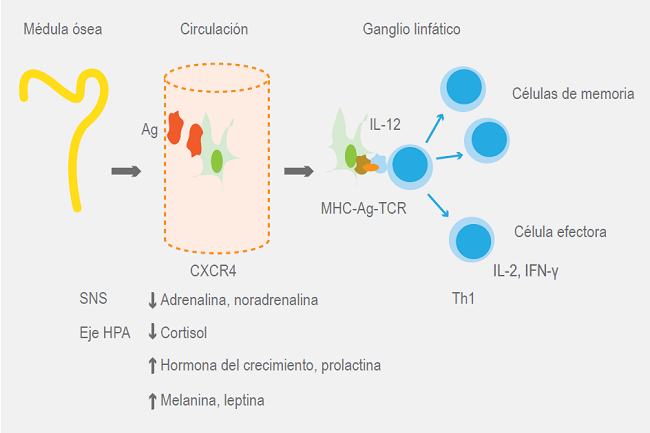 En sangre periférica hay un pico de células T vírgenes y de memoria al inicio del periodo de descanso en humanos y animales.67,68 La disminución del cortisol durante el sueño nocturno libera células T CXCR4+ de la médula ósea, las cuales, sin el impedimento del cortisol,69 penetran en nódulos linfáticos, lo que ocasiona su disminución en sangre durante el resto de la noche.68