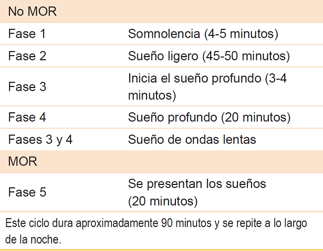 El sueño es un proceso que comprende diferentes ciclos de 90 minutos, a través de los cuales algunas partes del cerebro son activadas y otras desactivadas.14 Está integrado por los ciclos NO MOR y MOR.
