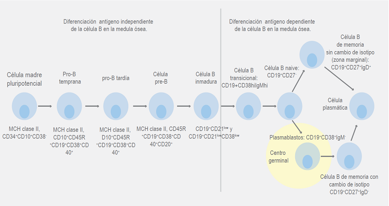 Las células pro-B derivadas de la médula ósea (CD19−CD10+/−CD20−CD22+CD24− vpreB-Igα+/−) se diferencian a células pre-B (CD19+CD10+CD20-CD24+verb+Igα+ intracelularμ+) y posteriormente a células B inmaduras/transicionales (CD19+CD10+ D20 CD24++IgM+).