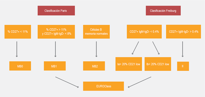 La clasificación EUROclass requiere la medición de los siguientes subtipos: células B totales, células B de memoria IgD−IgM−, células B transicionales y células B CD21low. Establece dos grupos principales: