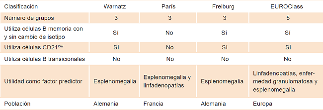 En 2002 se realizó la clasificación de Warnatz, que utiliza marcadores de memoria presentes en células B como CD27, CD21 y CD19: