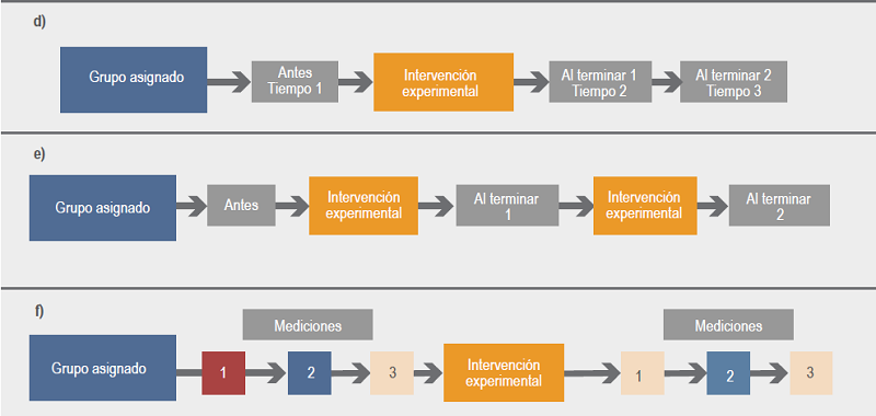 En este diseño, el tiempo es la variable independiente principal donde se hacen mediciones por periodos de tiempo (iguales o diferentes) de la(s) variable(s) de desenlace, antes y después de la aplicación de la intervención experimental. También pueden ser series temporales interrumpidas en las que se puede medir el efecto de una maniobra después de interrumpir su uso (Figura 2f), ya sea cambiando de tratamiento o dejando de otorgarlo.