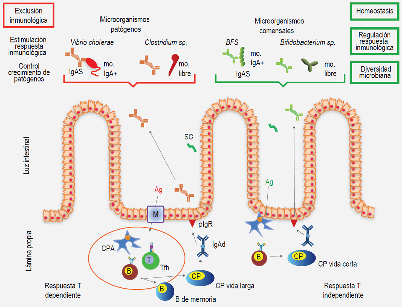 La función efectora más conocida de la IgAS es la exclusión inmunológica.19 La IgA interactúa a través de la red epítopo/parátopo o por los residuos glucosídicos, con las moléculas de la superficie de los microorganismos.20 Estas interacciones resultan en impedimentos estéricos que no permiten la unión de los microorganismos con los receptores expresados en la superficie de las células epiteliales y su posterior invasión a la mucosa. Estos microorganismos asociados con la IgAS son arrastrados hacia el exterior del cuerpo por el movimiento peristáltico y el moco. De esta manera, la IgA limita el crecimiento de bacterias patógenas para mantener una diversidad microbiana elevada.