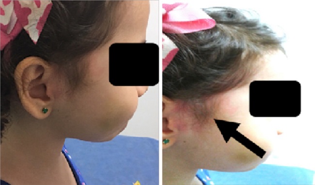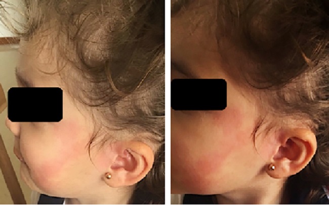 Casos clínicos: Tres niños entre cuatro y dos y medio años de edad: dos niñas y un niño. Presentaban máculas eritematosas unilaterales en la cara que llegaban el pabellón auricular de resolución espontánea, sin erupciones, prurito, angioedema, síntomas gastrointestinales ni respiratorios; su aparición estaba asociada con el consumo de alimentos ácidos y algunos dulces. Se observó la reproducción de los síntomas en el recorrido del nervio aurículo-temporal. Entre sus antecedentes se encontraban nacimiento por cesárea debido a desproporción cefalopélvica (caso 1), nacimiento por parto instrumentado con fórceps (caso 2) y nacimiento por cesárea debido a preeclampsia (caso 3).