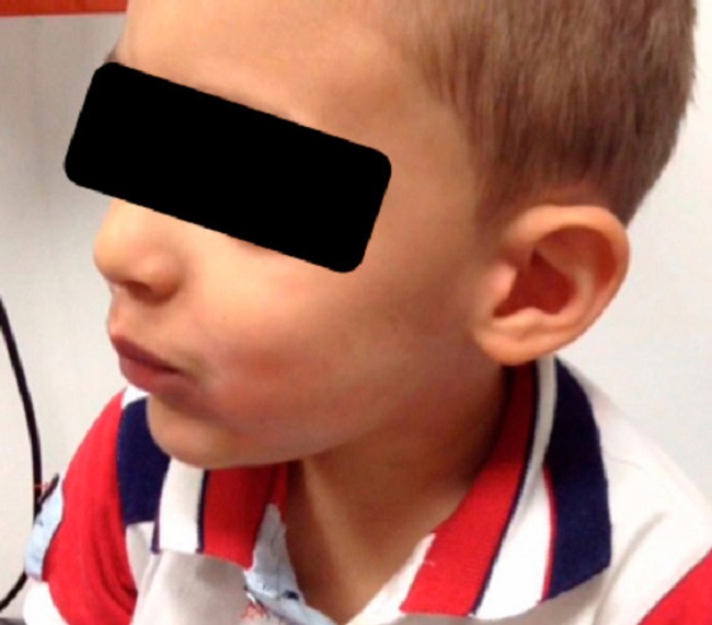 Paciente de tres años de edad remitido por el dermatólogo con diagnóstico de dermatitis perioral y sospecha de alergia alimentaria. El cuadro se presentaba inmediatamente tras el consumo de alimentos ácidos y dulces, con eritema en lado derecho de la cara y región preauricular (Figura 3), sin prurito, angioedema, síntomas respiratorios o gastrointestinales. Había sido tratado con esteroides tópicos sin mejoría. Por sospecha de síndrome Frey se realizó prueba de provocación con chocolate, en la que se reprodujeron los síntomas. Como antecedente relevante se encontraba nacimiento por cesárea debido a preeclampsia.