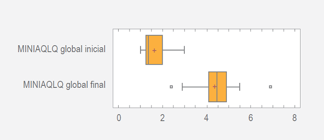 El cuestionario proporciona una puntuación global, donde 1 es la máxima limitación y 7 la ausencia de limitación. El resultado final se mostró como la puntuación total media de variación respecto a la media inicial.