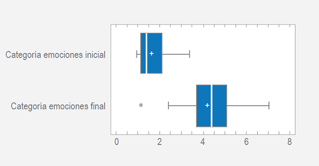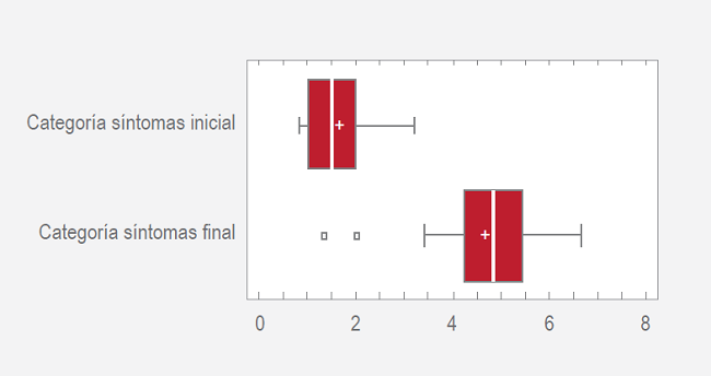 En relación con las diferentes dimensiones, la mejoría fue estadísticamente significativa para síntomas y emociones, con p = 0.0073 y p = 0.0004, respectivamente.