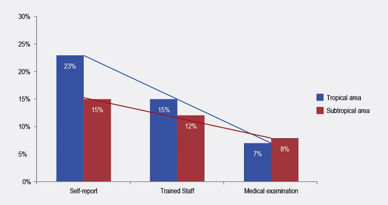 In tropical areas, one of the most highlight results of ISAAC phase 3 was the increasing prevalence of dermatitis compared with phase 1 and the high prevalence of dermatitis in Latin America countries. The higher frequency of current dermatitis among children 6 to 7 year-olds was observed in Barranquilla, Colombia with 24%. Those results are in stark contrast with data from similar study for Dennis et al., due in the same city (Barranquilla), at the same year, with the same ISSAC questionnaire and similar size population which parent-reported prevalence of less than 7% of current eczema.38 In that test, the prevalence of medical diagnostic of eczema was less than 2%. The frequency of severe eczema was similar between tests. Taking in consideration that the population, and the time of evaluation was the same, one possible explanation for the disparity between parent-reported results is that in the Dennis et al. test, parents received instructions for fill the questionnaire directly for a physician and in the ISAAC this explanation was given for no-physician personnel trained to conduct questionnaire. Dennis test also shows a difference between parent-reported prevalence and medical diagnosis, which is result to the physician’s ability to make differential diagnoses to various itchy skin conditions. In a second test Dennis et al., observed 10 years later, using the same methodology, that the prevalence of parent-reported eczema according ISSAC questionnaire, in Barranquilla was 11% and according medical diagnosis less than 7%.39 The increased prevalence agrees to the latest ISAAC reports, then again, the total prevalence differed between tests.