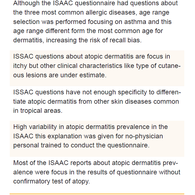 To summarize, the ISAAC provides information about the prevalence of atopic dermatitis in the general population in various countries as to compare the results and identify possible risk factors. However, the age of the patients who underwent the questionnaire and kind of questions answered by self-reporting may lead to some recall tilt especially in tropical regions, where many other itchy skin diseases are highly prevalent.