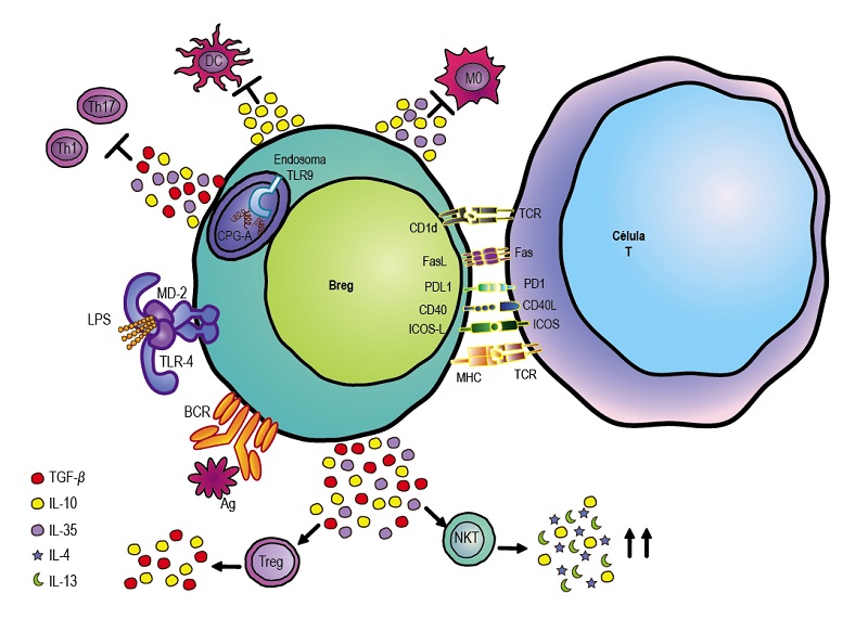 Las células Breg ejercen su efecto principalmente a través de la secreción de citocinas.15 Múltiples estudios refieren a IL-10 como la citocina clave para ejercer efectos inmunomoduladores por parte de esta y de otras poblaciones de células hematopoyéticas.12,13,14 Esta molécula desarrolla múltiples efectos supresores sobre distintos tipos celulares y se le reconoce como un importante factor inductor de tolerancia inmunológica en pacientes que sufren enfermedades inflamatorias crónicas.16 TGF-β también se ha identificado como un factor supresor secretado por las células Breg; esta citocina se halla involucrada en múltiples procesos que incluyen la modulación de respuestas inflamatorias y la remodelación de tejidos.
