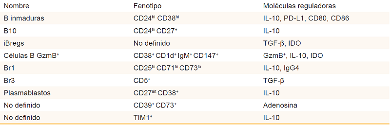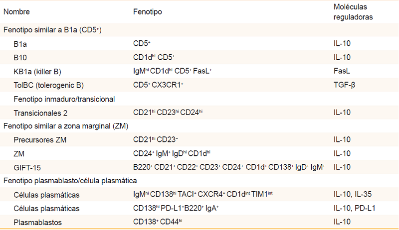La diversidad fenotípica y funcional, tanto de las células Breg de ratón como las humanas, deja en claro que la función inmunosupresora de los linfocitos B no está restringida a una subpoblación específica de este linaje hematopoyético. En este sentido, y a diferencia de lo que ocurre con los fenotipos efectores de linfocitos T CD4+ (Th1, Th2, Th17, Treg, etcétera), ningún factor de trascripción que defina la función reguladora de las células B ha sido identificado; además, los fenotipos de las distintas clases de Breg son diversos, compartiendo solamente algunas de las moléculas con las que se caracterizan. Ejemplo de ello son algunas de las subpoblaciones de Breg en ratón: las células B10 del bazo comparten características con las células B1 CD5+29,30 de la cavidad peritoneal, con las células B de zona marginal (CD1dhi CD21+ CD23−)31 y con las células inmaduras en estadio transicional 2 (CD21hi CD23hi CD24hi).32