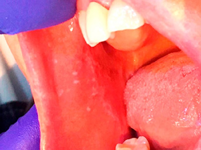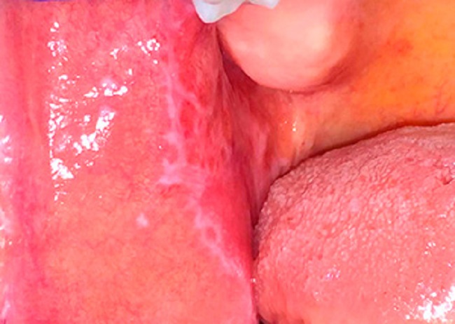 Mujer de 54 años referida de la Clínica de Diagnóstico, Facultad de Odontología, Universidad Juárez del Estado de Durango, por múltiples lesiones en espejo, placas blancas en mucosa yugal, bordes laterales de lengua y encía insertada, que en algunas ocasiones se ulceraban y eran dolorosos. La paciente refería sensación de ardor y dolor con alimentos irritantes, lo que limitaba en forma importante la ingesta, incluso en más de tres ocasiones la paciente se automedicó antiinflamatorios no esteroideos.