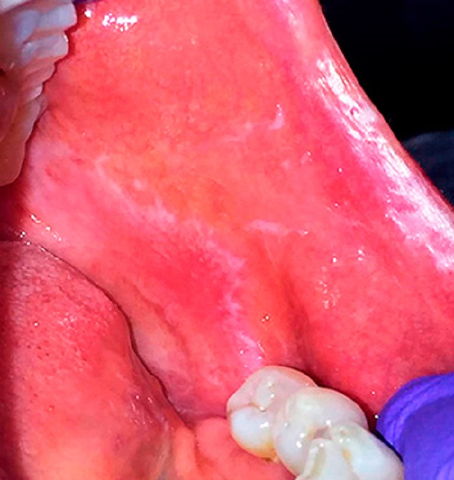 Las formas reticulares o atróficas erosivas pueden afectar piel, anexos cutáneos y mucosas; frecuentemente las lesiones bucales preceden a las cutáneas y se presentan de manera intraoral. El médico dermatólogo no observó ninguna lesión en la piel de la paciente.18,19