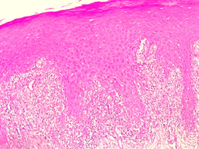 El liquen plano se caracteriza histopatológicamente por diferentes grados de ortoqueratosis y paraqueratosis, que se presentan en la superficie epitelial dependiendo del sitio donde se tomó la biopsia; el tamaño del estrato espinoso puede variar, los clavos epiteliales pueden tener la apariencia de dientes de sierra, la degeneración hidrópica es evidente; estas anomalías frecuentemente están acompañadas de un intenso infiltrado de predominio linfocitario T en banda subepitelial. La degeneración de los queratinocitos se puede observar en el área de interfaz entre el epitelio y el tejido conectivo y se conoce como cuerpos de Civatte.1,6,7,8