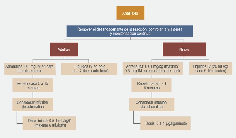 La identificación temprana de la anafilaxia permite el empleo de adrenalina, que no debe ser reemplazada por otro medicamento y se debe administrar a la dosis adecuada y por las rutas establecidas, para evitar complicaciones posteriores. Cuando se considere un posible medicamento sospechoso se debe recomendar evitarlo, al igual que las moléculas estructuralmente similares que puedan tener reactividad cruzada, hasta que se realicen los estudios alergológicos y se determine la causalidad para ofrecer alternativas terapéuticas.