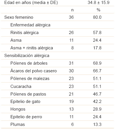 Se incluyeron 257 pacientes, 45 fueron alérgicos a alimentos, para una prevalencia global de 17.5 % (IC 95 % = 13.3-22.6). En este grupo, la edad media fue de 34.8 ± 15.9 años, 80 % del sexo femenino y casi 60 % padecía rinitis alérgica; los aeroalérgenos que más frecuentemente sensibilizaron a los pacientes fueron los pólenes de los árboles y los ácaros del polvo casero (cuadro 1).