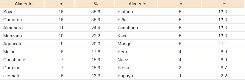 En general, la soya, el camarón y la almendra fueron los alimentos que más ocasionaron síntomas de alergia; los menos frecuentes fueron la nuez, la fresa y la papaya (cuadro 2). La mayoría de los pacientes fueron alérgicos a un alimento, 16 de 45 (35.6 %), mientras que la frecuencia de alergia a dos, tres y cinco alimentos se observó en ocho de 45 (17.8 %).