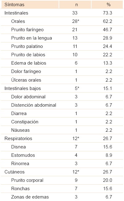 Results: The prevalence of food allergy was 17.5% (95% CI = 13.3% to 22.6%). The main foods that caused symptoms were soy, shrimp, almonds, avocado and peanuts. The majority of patients who were allergic to a single food were 35.6%, two foods were 17.8% and three foods were 17.8%. The most frequent affections of food allergy were oral (62.2%): itching of the pharynx, tongue and palate; respiratory (26.7%), dyspnea and sneezing; and skin (26.7%), itching and hives.