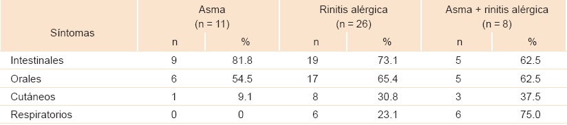 En cuanto a la frecuencia de síntomas relacionados con la alergia alimentaria, los más relevantes fueron los que involucraban el sistema gastrointestinal y de ellos los orales (prurito en la faringe, la lengua y el paladar) (cuadro 3). Les siguieron las molestias respiratorias (disnea y estornudos) y las cutáneas (prurito corporal y ronchas). El cuadro 4 muestra los síntomas relacionados con el consumo de alimentos de acuerdo con la enfermedad respiratoria alérgica: en el asma y la rinitis alérgica predominaron los síntomas orales, seguidos de los cutáneos; en el asma combinada con rinitis alérgica sobresalieron los síntomas respiratorios y los orales.