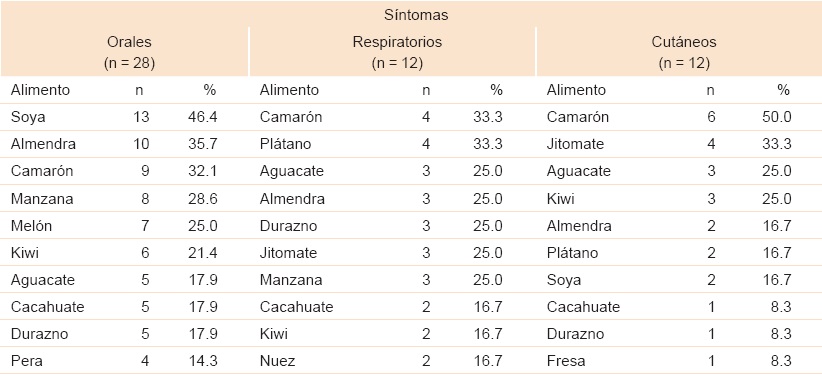 Los principales alimentos relacionados con los síntomas orales fueron soya, almendra, camarón, manzana y melón (cuadro 5); con las molestias respiratorias fueron camarón, plátano, aguacate, almendra y durazno; con los síntomas cutáneos fueron camarón, jitomate, aguacate, kiwi y almendra.