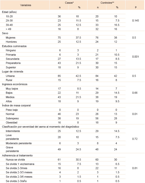 Al analizar la severidad del asma en el momento del diagnóstico, en 54 pacientes fue intermitente, en 35 leve persistente, en 14 moderada persistente y en 97 grave persistente. Al estratificar por controlados y no controlados, 49 pacientes (24.5 %) con asma grave persistente fueron casos y 48 (24 %), controles; 25 pacientes (12.5 %) intermitentes fueron casos y 29 (14.5 %), controles. El total de los resultados se muestran en el cuadro 1. Al estratificar por grupos etarios, 36 casos (18 %) se ubicaron entre 18 y 28 años y 33 controles (16.5 %) entre 39 y 48 años, que constituyeron los grupos más representativos. Respecto a la escolaridad, 43 casos (21.5 %) y 30 controles (15 %) terminaron la preparatoria; 169 (84.5 %) residían en el sector urbano, 85 casos (42.5) y 84 (42 %) controles. Respecto al índice de masa corporal, 46 casos (23 %) se ubicaron como normales y solo 16 pacientes (8 %) presentaron obesidad; entre los controles, 56 pacientes (28 %) se identificaron en la categoría de sobrepeso (p = 0.01). Al analizar las comorbilidades asociadas con el asma, 85 casos (42.5 %) y 84 controles (42 %) presentaron rinitis alérgica (p = 0.5). Los resultados completos del análisis de frecuencias y porcentajes entre casos y controles y sus respectivos valores de p se detallan en el cuadro 2.
