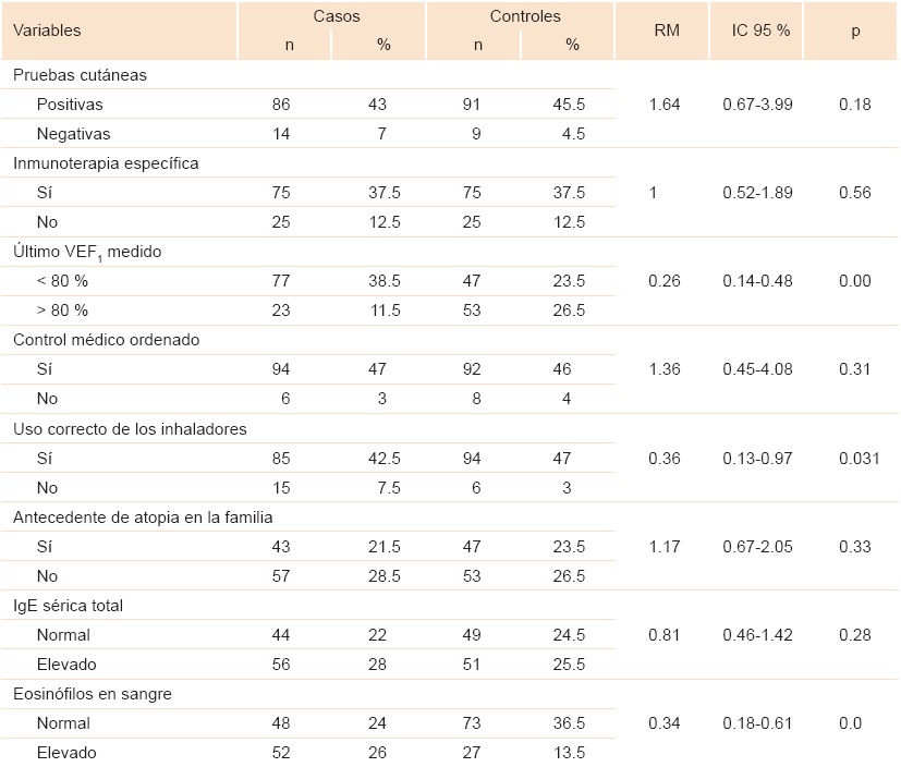 Respecto a los valores de pruebas funcionales respiratorias, se tomó en cuenta el valor VEF1 medido en la última espirometría que tenía cada paciente, teniendo en cuenta que < 80 % podría ser un factor de riesgo. Los pacientes con VEF1 > 80 % fueron 23 casos (11.5 %) y 53 controles (26.5). El RM en este grupo indicó que se trataba de un factor protector (0.26, IC 95 % = 0.14-0.48), p = 0.00. El 47 % de los casos (94 pacientes) y 46 % de los controles (92 pacientes) señalaron el control médico estricto en su cita por consulta externa; no se observó asociación estadísticamente significativa (RM = 1.36, IC 95 % = 0.45-4.80). Se encontró asociación de protección cuando los pacientes utilizaron correctamente los inhaladores (RM = 0.36, IC 95 % = 0.13-0.97), p = 0.031. Los antecedentes familiares de atopia no mostraron asociación (RM = 1.17, IC 95 % = 0.67-2.05), p = 0.3. En cuanto al recuento de eosinófilos absolutos en sangre periférica, los valores normales se constituyen como un factor protector; fueron normales en 48 casos (24 %) y 73 controles (36.5 %), RM = 0.34, IC 95 % = 0.18-0.61 y p = 0.00.