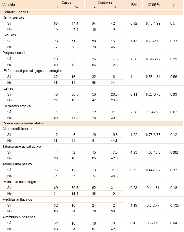 Se analizaron varias condiciones ambientales sin que alguna representara un factor de riesgo, como el uso de aire acondicionado en el hogar o en el trabajo, la presencia de mascotas en el hogar y el uso de medidas antiácaros. El tabaquismo actual y activo se identificó como factor de riesgo (RM = 4.23 IC 95 % = 1.35-13.2, p = 0.007), sin embargo, el tabaquismo pasivo no demostró ser factor de riesgo (RM = 0.85, IC 95 % = 0.44-1.62, p = 0.37). Manifestaron no tener alfombras o peluches, 68 casos (34 %) y 84 controles (42 %), RM = 0.4, IC 95 % = 0.2-0.79, p = 0.04, lo que indicó que es un factor protector.