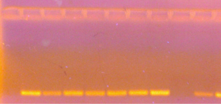 A partir de una muestra de sangre periférica se extrajo el ADN por un método combinado de las técnicas Fenol/Sevag y Salting-Out,15,16 estandarizado en el Instituto de Investigaciones Genéticas de la Universidad del Zulia. La cantidad y pureza del ADN fueron medidas por absorbancia a 260 nm y por la relación DO260/DO280 (> 1.8), respectivamente. La integridad del ADN se verificó en gel de agarosa teñido con bromuro de etidio; posteriormente, el ADN se ajustó a una concentración de 200 µg/mL para su posterior amplificación por PCR.