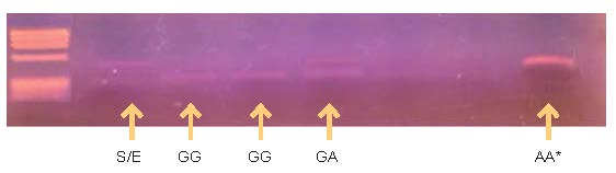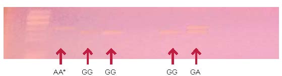 El polimorfismo 308 del gen TNFα consiste en una transición guanina a adenina, en la posición 308 antes del promotor del gen, encontrada en más de 1 % de la población. El producto del ADN amplificado por PCR es de 144 pb. La enzima de restricción Ncol corta el alelo G (TNF1) en la secuencia de restricción C’CATGG, lo que da dos diferentes fragmentos, uno de 126 pb y otro de 18 pb, así los sujetos homocigotos para el alelo G o TNF1 exhiben en el gel de agarosa una única banda de 126 pb, los individuos heterocigotos (TNF1/TNF2) dos bandas, una de 144 pb y otra de 126 pb, y los homocigotos para el alelo A o TNF2, una banda de 144 pb (figura 4).