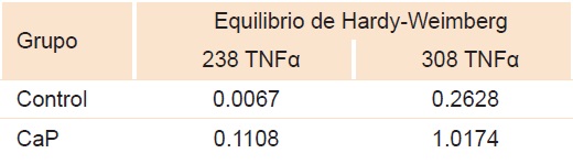 Los polimorfismos 238 y 308 del gen TNFα se encontraron en equilibrio de Hardy-Weimberg en ambos grupos. Mediante chi cuadrada de Pearson se demostró que las frecuencias no difirieron estadísticamente de las esperadas (para un nivel de significación de p < 0.05) para ambos grupos (casos y controles); en ambos polimorfismos se observó chi cuadrada < 3.84 (cuadro 1).
