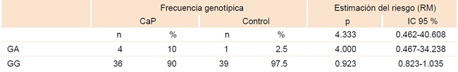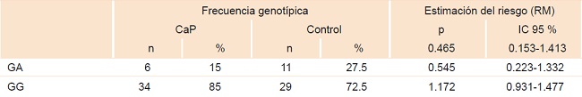 El riesgo de CaP asociado con la presencia de uno u otro polimorfismos GA (GG + GG, GG + GA o GA + GG) no fue significativo estadísticamente: RM = 1.286, IC 95 % = 0.480-3.442, p = 0.401); en el haplotipo GG + GG: RM = 1.071, IC 95 % = 0.817-1.404; en GA + GG y GG + GA: RM = 0.833, IC 95 % = 0.407-1.705. No se observó el haplotipo GA + GA en los sujetos control ni en los pacientes con CaP.