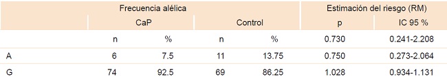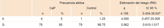 La probabilidad de riesgo entre las frecuencias alélicas y el CaP fue de 4.158, no significativa para ambos polimorfismos (A o G). Para el alelo A, en el polimorfismo 238 se observó RM = 4.00, IC 95 % = 0.457-35.008, no significativo estadísticamente (cuadro 4).