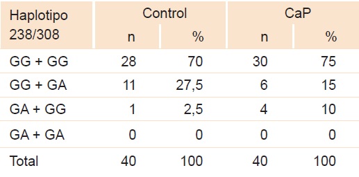 La frecuencia haplotípica de 238 y 308 del gen TNFα en pacientes con CaP y en individuos sanos control se identificó RM = 1.286. La tendencia de este resultado se repitió para el haplotipo GG + GG con RM = 1.071, estadísticamente no significativa. Sorprendió la ausencia en esta población del haplotipo GA + GA.