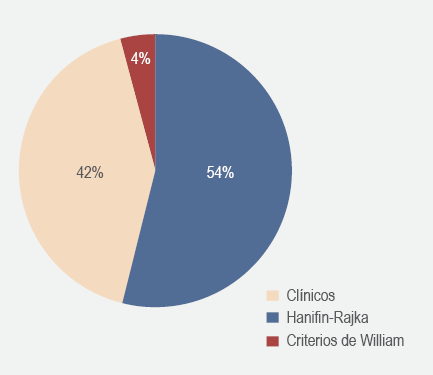 Nuestros resultados muestran que los médicos prefieren utilizar los criterios de Hanifin-Rajka, probablemente por la mayor difusión de estos criterios durante la formación de los médicos especialistas y la falta de difusión e implementación de los criterios de Williams, que son utilizados solo 2 % de los encuestados.17,18