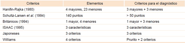 El diagnóstico de DA es clínico y los criterios más utilizados en la práctica clínica son los de Hanifin y Rajka, que consideran parámetros objetivos y subjetivos como prurito y afectación del sueño. No obstante, son laboriosos y no toman en cuenta manifestaciones clínicas de la DA de inicio tardío. Otros criterios diagnósticos se describen en el cuadro 1.