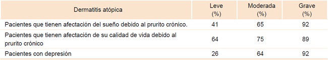 El 89 % de los pacientes portadores de DA presentaba alteraciones del sueño y este porcentaje se incrementaba a 92 % en aquellos con DA grave; 60 % de los pacientes con DA moderada tenía datos de depresión y de ellos, solo 12 % utilizaba antidepresivos. La depresión se asociaba con la gravedad de la enfermedad y estaba presente en 92 % de los pacientes con DA grave (cuadro 2).