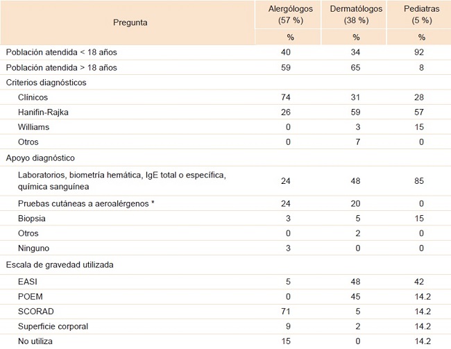 Resultados: Se realizaron 114 encuestas, 56 % de los participantes fueron alergólogos, 38 % dermatólogos y 5 % pediatras. Se identificó que 54 % utilizaba criterios clínicos para realizar el diagnóstico de DA y 42 %, los criterios de Hanifin-Rajka; como complemento diagnóstico, 38 % solicitaba IgE total o específica, biometría hemática y química sanguínea. Los encuestados refirieron que 90 % de los menores de 18 años presentaba DA leve, 8 % moderada y 2 % grave; y los mayores de esa edad, 89 % leve, 6 % moderada y 5 % grave. La atención del paciente era multidisciplinaria, ya que 57 % de los encuestados solicitaba valoraciones conjuntas con oftalmología, dermatología y alergología.